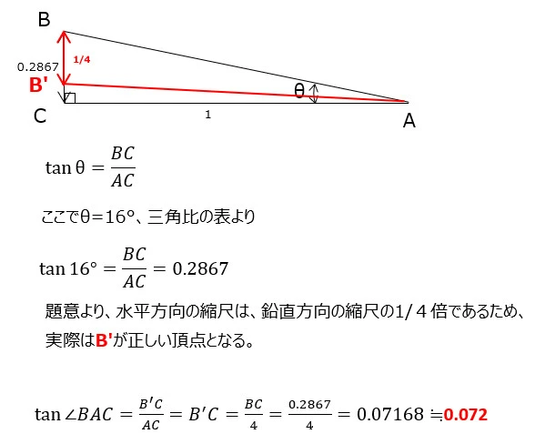 図1のθはちょうど16°であったとする。しかし、図1の縮尺は、水平方向が1/100000であるのに対して、鉛直方向は1/25000であった。