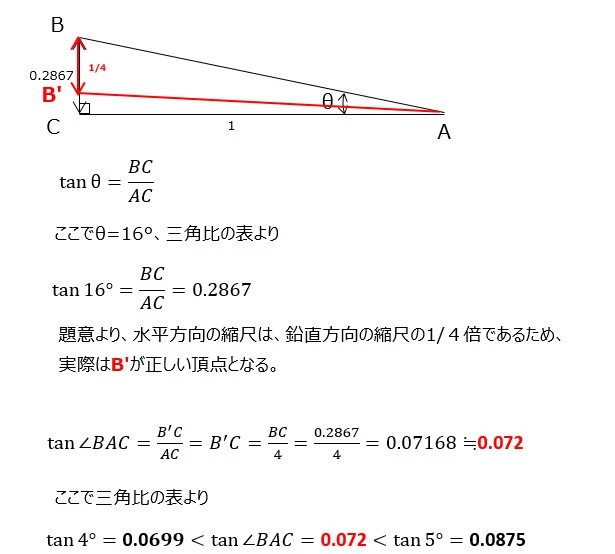 図1のθはちょうど16°であったとする。しかし、図1の縮尺は、水平方向が1/100000であるのに対して、鉛直方向は1/25000であった。
