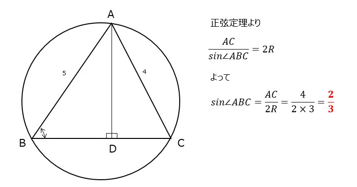 外接円の半径が3である△ABCを考える。点Aから直線BCに引いた垂線と直線BCとの交点をDとする。