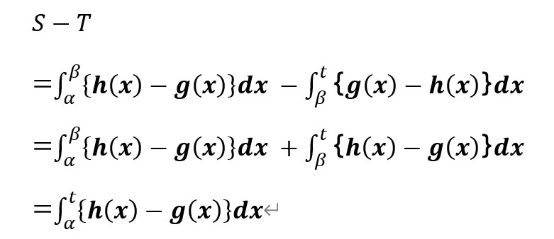 = ∫[α→β]{h(x)−g(x)}dx − ∫[β→t]{g(x)−h(x)}dx