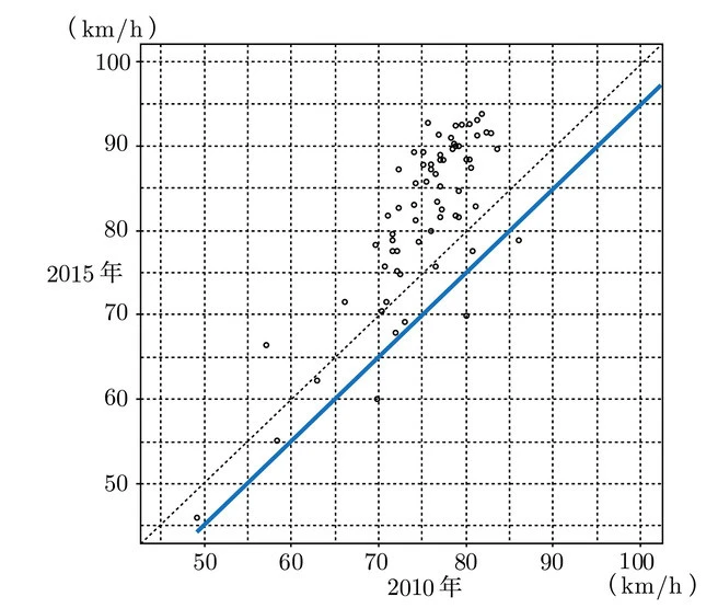 (2)図2は、2010年と2015年の速度の散布図である。ただし、原点を通り、傾きが1である直線(点線)を補助的に描いている。また、この散布図には、完全に重なっている点はない。