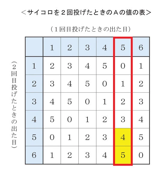 2回目を投げる場合を考えるので、さいころの2つの出目の和を6で割った余り(すなわちA)をまとめた表を用意します。