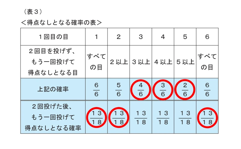 したがって、Aが2以下のときのみ2回目を投げると「得点なし」となる確率を最小にできます。