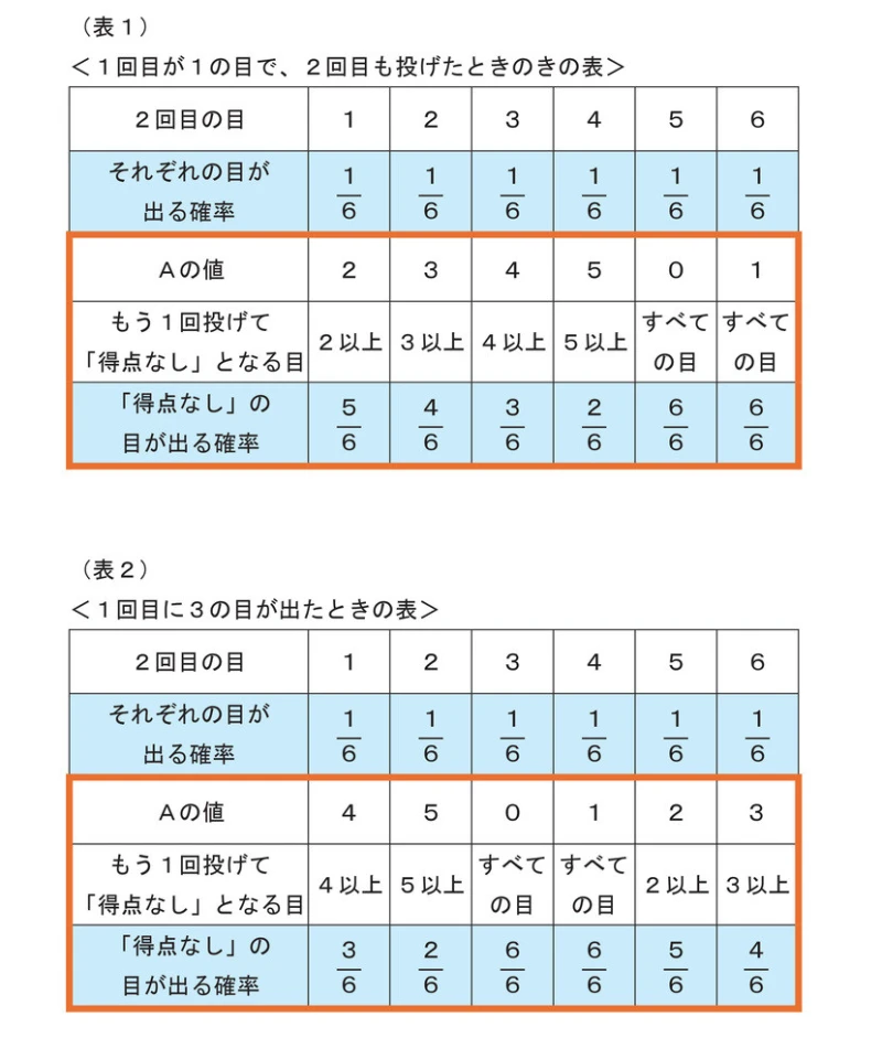 (表1)と(表2)を比べると、オレンジの枠で囲まれた部分は、横の方向に2だけずれているだけで、Aの値や得点なしとなる確率はすべて同じであることがわかります。これは、1回目の目が1、3以外のときも全く同様です。すなわち、1回目に何の目が出たとしても、2回目を投げると得点なしとなる確率は常に 13/18 になるということが言えます。