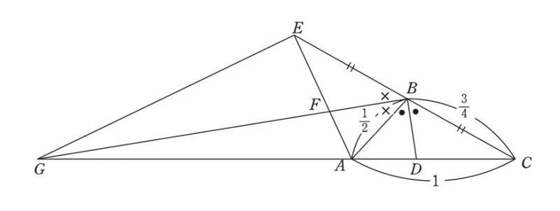 このとき、∠ABCの二等分線と辺ACとの交点をDとすると、AD=( ウ )/( エ )である。直線BC上に、点Cとは異なり、BC=BEとなる点Eをとる。∠ABEの二等分線と線分AEとの交点をFとし、直線ACとの交点をGとすると