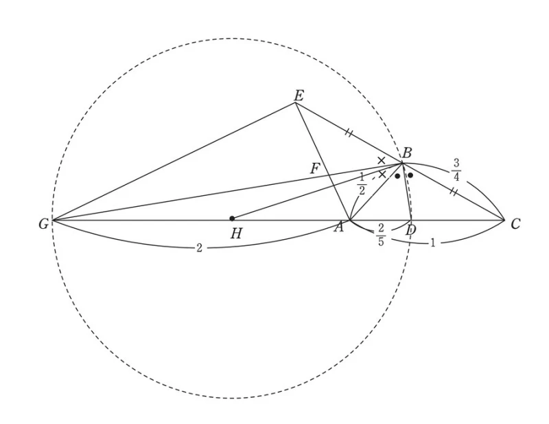 直線BDは∠ABCの二等分線、直線BGは∠ABEの二等分線なので、∠GBDの大きさは∠EBCの半分、すなわち∠GBD=90°となります。よって、3点D、B、Gは、線分DGを直径とする円周上の点になります。また、点Hは線分DGの中点なので、△GBDの外接円の中心(外心)です。