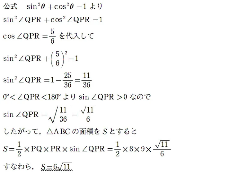 まず、cos∠QPR=( タ )/( チ )であることから、ΔPQRの面積は