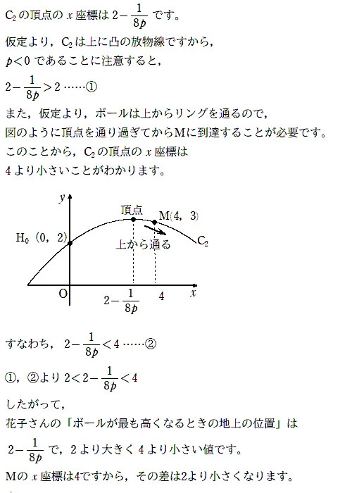 よって 2<2-1/8p であるので、花子さんの方がボールが最も高くなる地上位置がMに近いです。