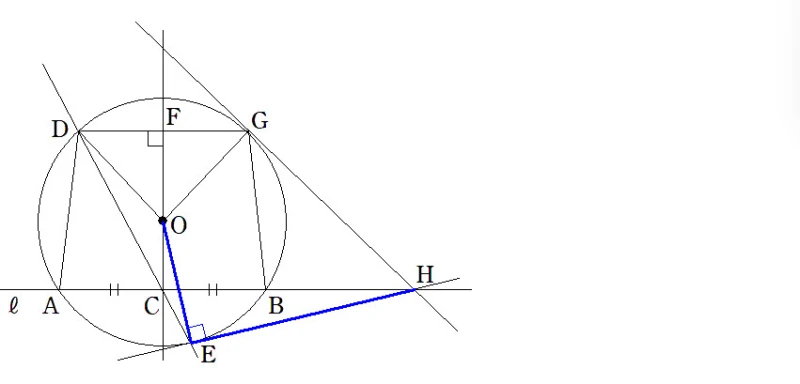 このとき、直線lと点Dの位置によらず、直線EHは円Oの接線である。このことは、次の構想に基づいて、後のように説明できる。
