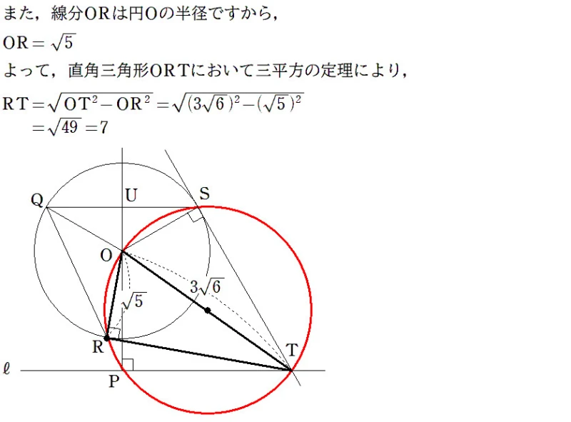 RT=√(OT2-OR2)=√((3√6)2-(√5)2)=7となります。