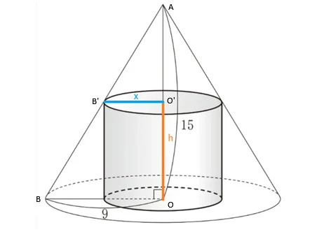 (2)後の図のように底面が半径9の円で高さが15の円錐(すい)に内接する円柱を考える。円柱の底面の半径と体積をそれぞれx、Vとする。Vをxの式で表すと