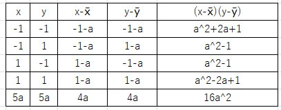 をデータWとする。データWのxとyの相関係数は0である。データWに、新たに1個の値の組を加えたときの相関係数について調べる。なお、必要に応じて、後に示す表1の計算表を用いて考えてもよい。
