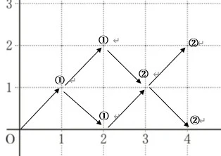 条件(*)を満たす点Pの移動の仕方は図2のようになる。例えば点O(0,0)から点A(2,0)までの点Pの移動の仕方は、点O(0,0)から点(1,1)まで移動したのち点A(2,0)に移動する場合と、点O(0,0)から点(1,−1)まで移動したのち点A(2,0)に移動する場合のいずれかであるため、2通りある。このとき、この移動の仕方の総数である2を、四角囲みの中の数字で点A(2,0)の近くに書く。図2における他の四角囲みの中の数字についても同様に考える。
