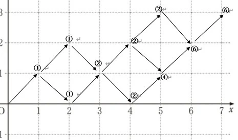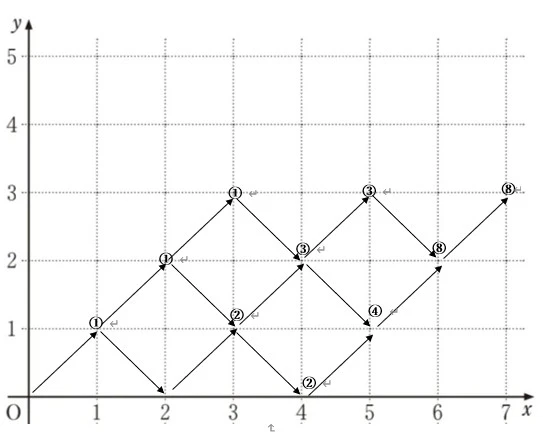 「点Qの座標がつねに0以上3以下であり、かつ7回投げ終えた時点で点Qの座標が3であり、3回投げ終えた時点で点Qの座標が1である」ときの座標の動き方は以下の通りであります。