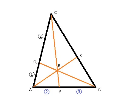 △ABCにおいて辺ABを2:3に内分する点をPとする。辺AC上に2点A、Cのいずれとも異なる点Qをとる。線分BQと線分CPとの交点をRとし、直線ARと辺BCとの交点をSとする。