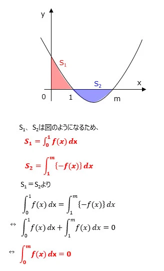 S1=S2は∫01f(x)dx=∫1m-f(x)dxとなります。