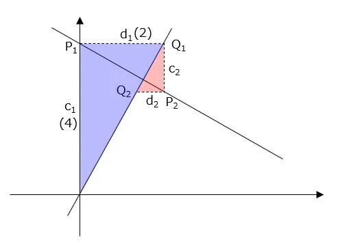 ・Q1からy軸に平行な直線を引いて、直線②との交点をP2とする。