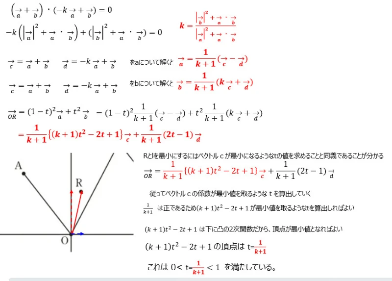lとの距離が最小になるには垂線すなわちベクトルCが重要であること、あとは正負の関係等を用いて最小限の計算で抑えることが出来たら最適です。