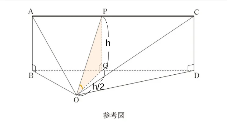 飛行機Pが点Aから点Cまで線分AC上を飛ぶ間における、飛行機Pを見上げる角∠POQの大きさについて考察しよう。