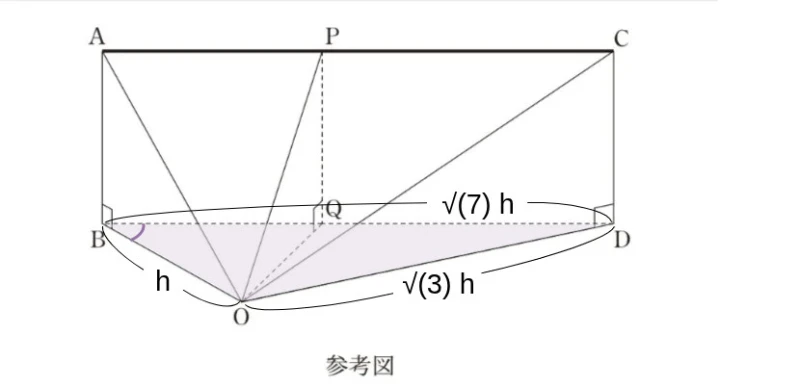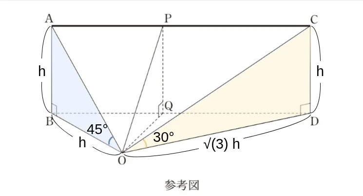 ある時刻に、飛行機Pを見上げる角が45°であったとし、そのときの飛行機Pの位置をA、点Aから地面に下ろした垂線と地面との交点をBとする。また、その140秒後に、飛行機Pを見上げる角が30°であったとし、そのときの飛行機Pの位置をC、点Cから地面に下ろした垂線と地面との交点をDとする。さらに、∠BOD=150°であったとする。